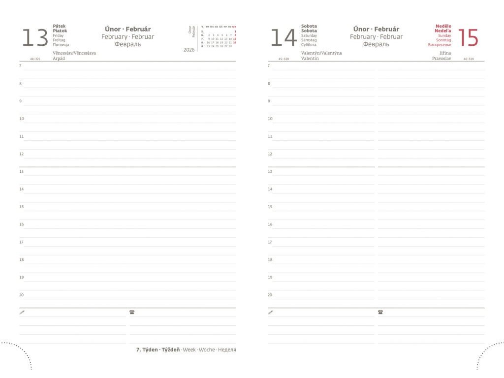 Diář obsahuje: osobní údaje, plánovač dovolené (měsíční přehled), plánovací kalendář, telefonní předvolby, státní svátky České a Slovenské republiky, mezinárodní svátky, roční výhled, denní layout, adresář, mapa Evropy a České a Slovenské republiky