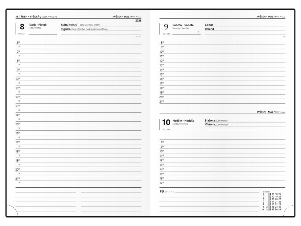 Oživte svůj den barvami! Denní diář z jemné vivelly ve formátu A5. Má velký prostor pro poznámky a plánování.