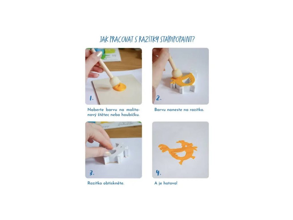 Nanášení barvy na razítka je samo o sobě velkou zábavou. Velké obtisky lze využít k dalšímu tvoření: dokreslování detailů, vystřihování, k výrobě koláží, matematických pomůcek či k dekoraci textilních produktů. Krásně se obtiskávají i do hmot. Barvy na razítka vybírejte podle materiálu, na který budete tiskat. Na textil použijte textilní, na papír, dřevo, karton akrylové, či temperové barvy. Po použití razítka snadno umyjete vodou a měkkým kartáčkem. Tip: obtisky krásně vyniknou na kratonové, kraftovém podkladu v kombinaci s bílou barvou.