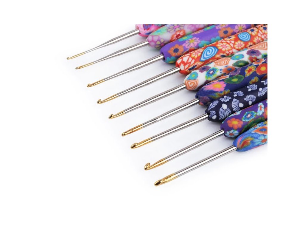 S barevnými háčky bude háčkování hned veselejší. Jejich silikonovou rukojeť zdobí různé květinové vzory. Pohodlně se drží v ruce.