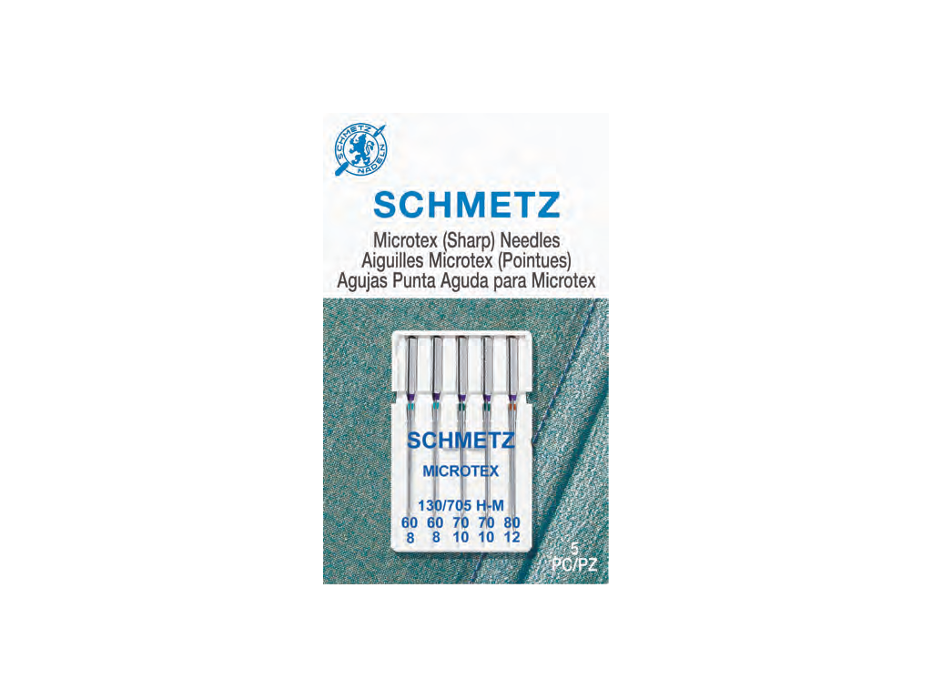 Jehla SCHMETZ Microtex je obecně známá jako „ostrá“ jehla. Má úzký ostrý hrot, vytváří dokonale rovné stehy pro sešívání a prošívání a krásné prošívání při módním šití.