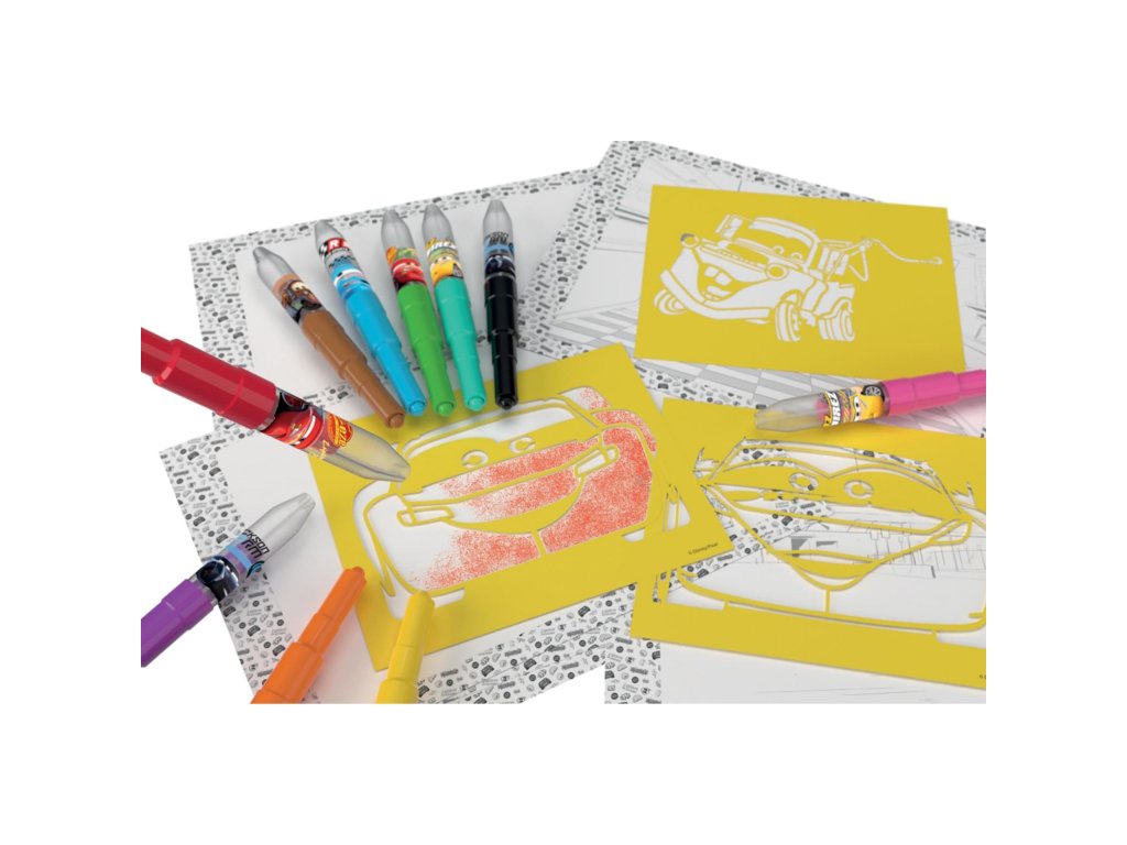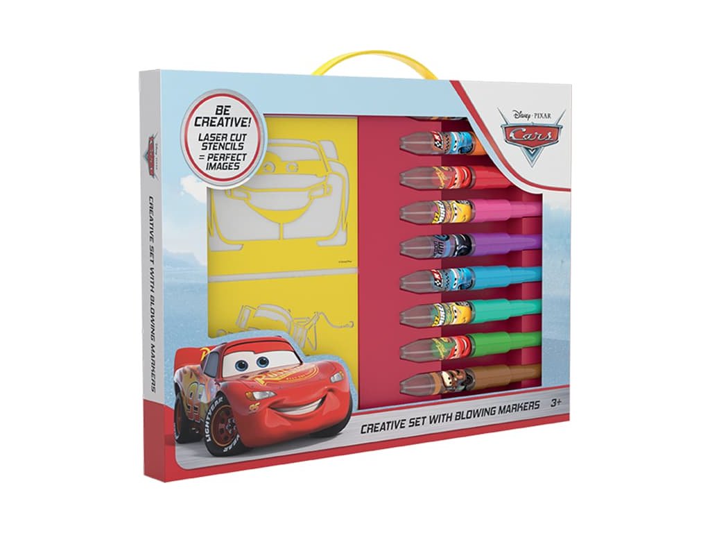 Set obsahuje 10 foukacích fixů s potiskem, 6 papírových šablon s obrázky a 24 listů ke kreslení, vše v praktické krabičce.