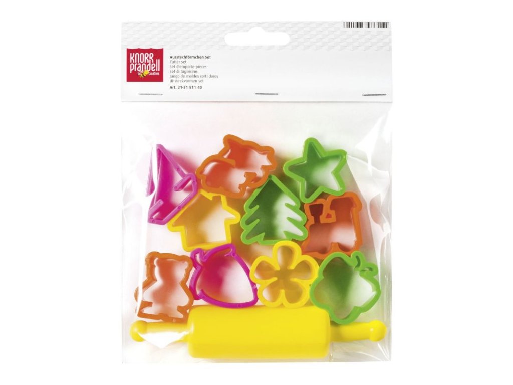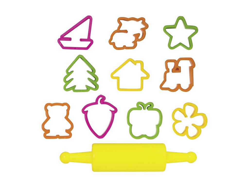 Vykrajovátka z plastu 10 ks + plastový váleček na práci s modelovací a samotvrdnoucí hmotou, polymerovými hmotami (Cernit, FIMO, Prémo) apod. Rozměry vykrajovátek cca 4x3cm, rozměr válečku délka cca 14cm, průměr cca 3cm. Po použití očistěte vodou a nechte dobře vyschnout. Upozornění: Nebezpečí udušení. Obsahuje malé části, které mohou být spolknuty. Pracujte pod dohledem dospělých. Uchovejte všechna varování. Nevhodné pro děti do 3let.