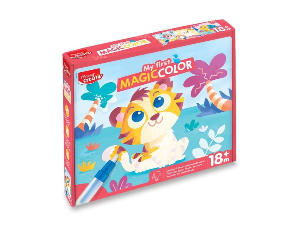Kreativní sada Maped Creativ Early Age My First Magic Color - moje první magické omalovánky, kde pomocí vodního pera děti vybarvují kartičky a objevují kouzelná zvířátka, která se objevují jako mávnutím proutku. Po několika minutách obrázky samy zmizí a děti se mohou pustit do malování znovu. Jedná se o čistou aktivitu bez nepořádku s magickým efektem, ideální pro nejmenší.