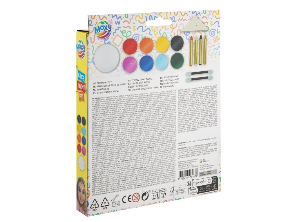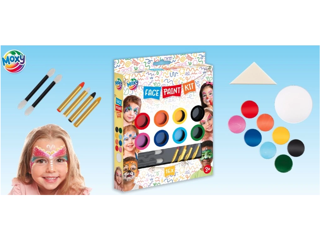 Balení obsahuje: 8 barev na obličej - zelená, růžová, modrá, oranžová, žlutá, červená, sv. modrá, černá, 4 barvy v tužce - bílá, černá, žlutá, červená, 1 extra bílá barva, 3 aplikátory na barvičky.