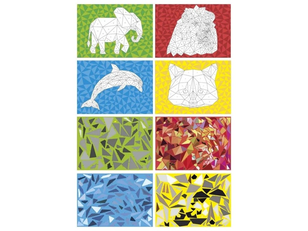 Sada obsahuje 4ks obrázků A4 (lev, slon, delfín, mýval) a 4 archy se samolepkami.