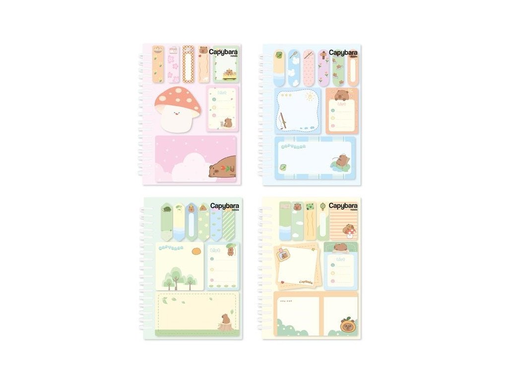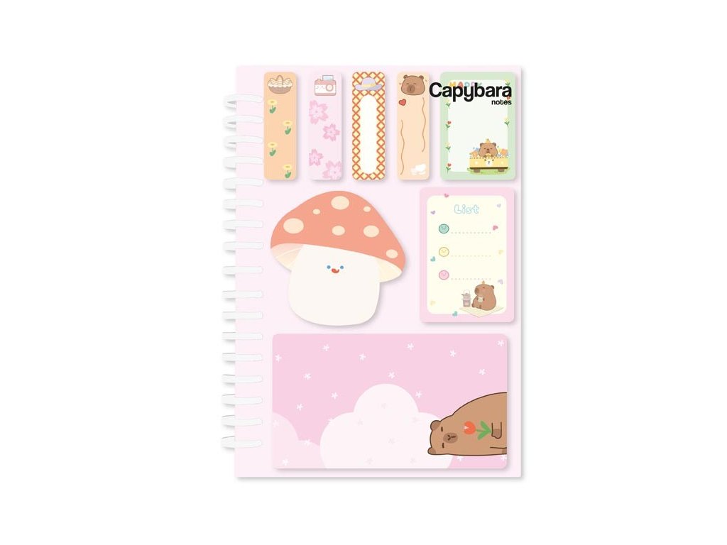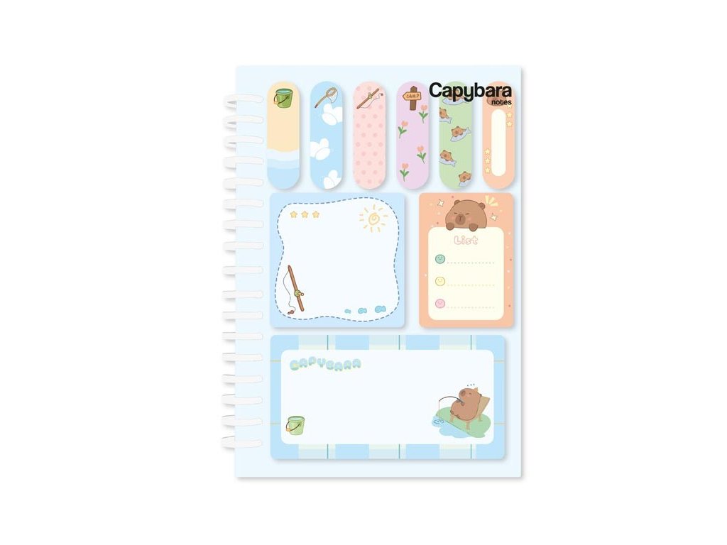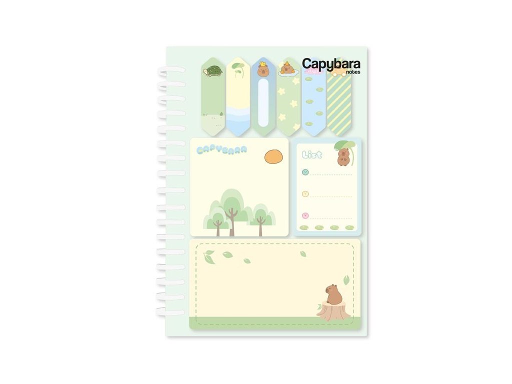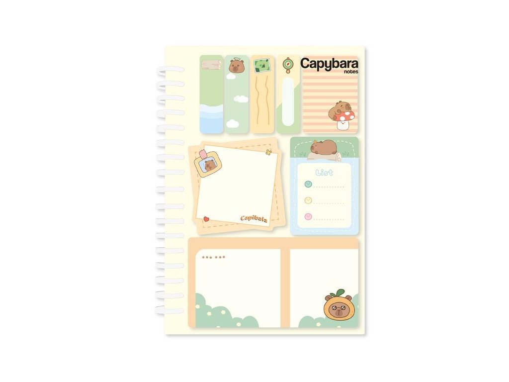 Samolepicí set bločků se spirálou je roztomilý i praktický pomocník pro všechny, kdo si rádi zapisují, připomínají, plánují… a milují kapybary! Obsahuje mix různě velkých bločků na poznámky, úkoly i drobné vzkazy.