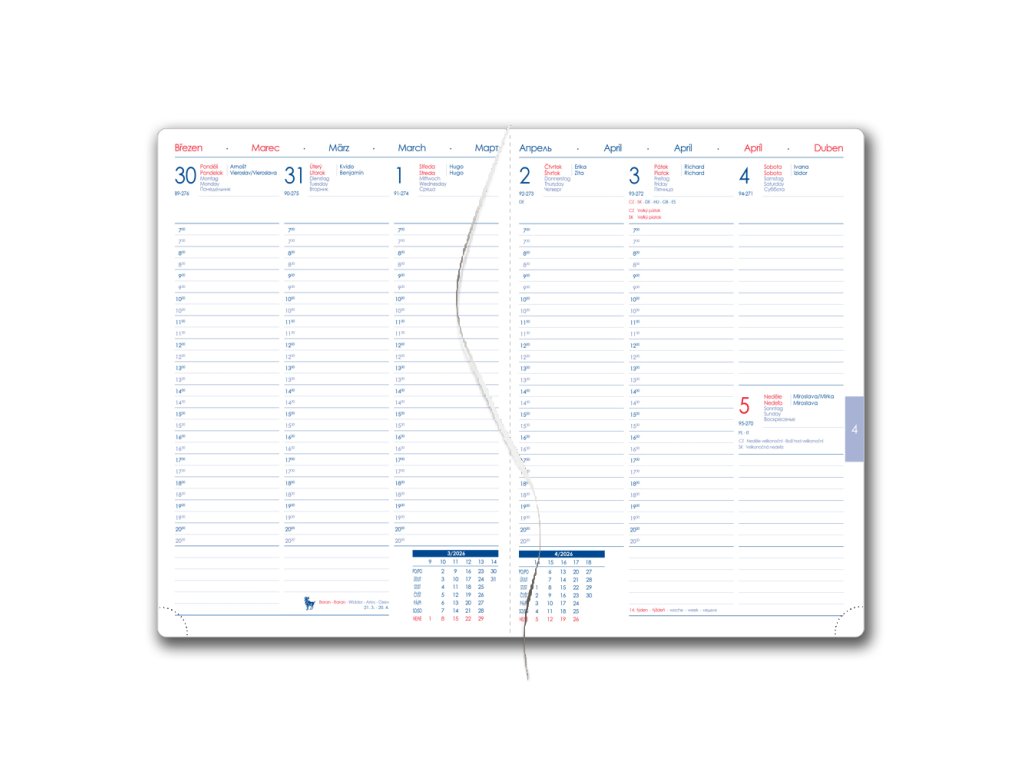 Diář obsahuje: kulaté odtrhávací rožky a bílou záložku