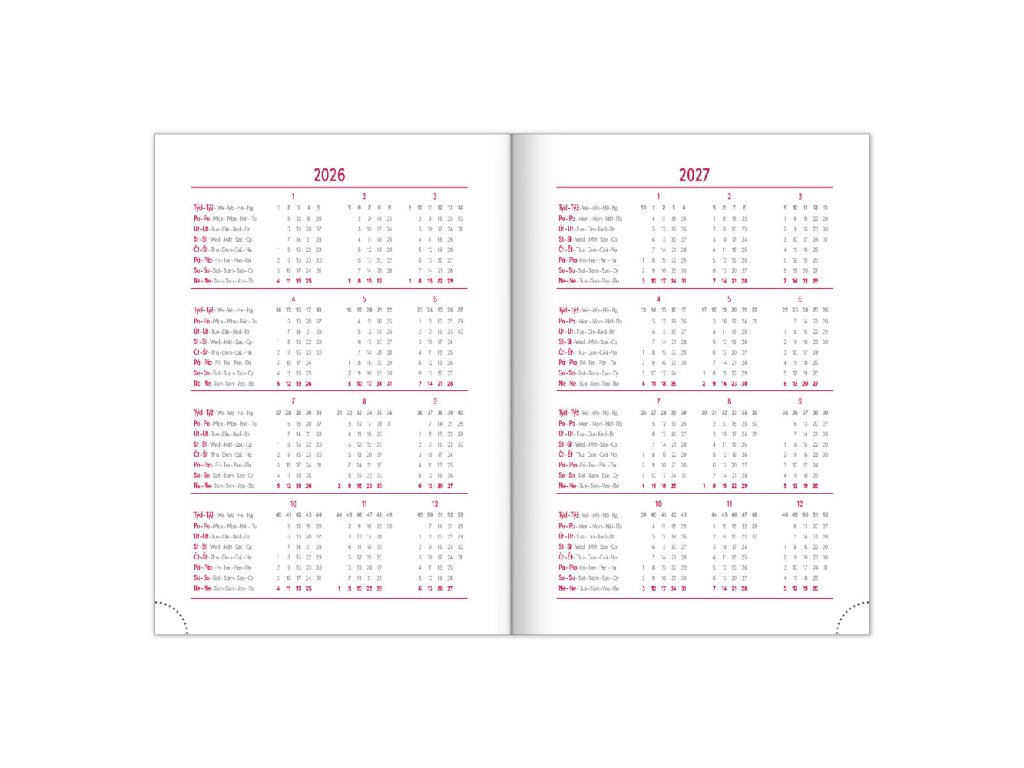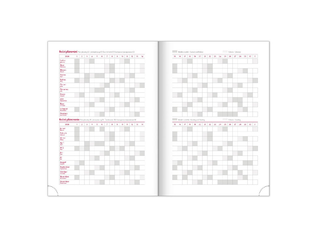 Diář obsahuje: místo pro osobní údaje, měsíční plánování 2026 a 2027,