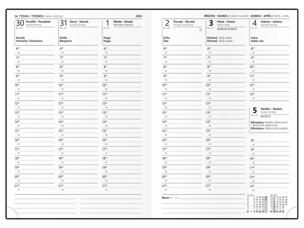 Týdenní diář ve formátu A5 je vyráběný z oblíbeného, jemně strukturovaného materiálu. Diář má velký prostor pro poznámky a plánování.