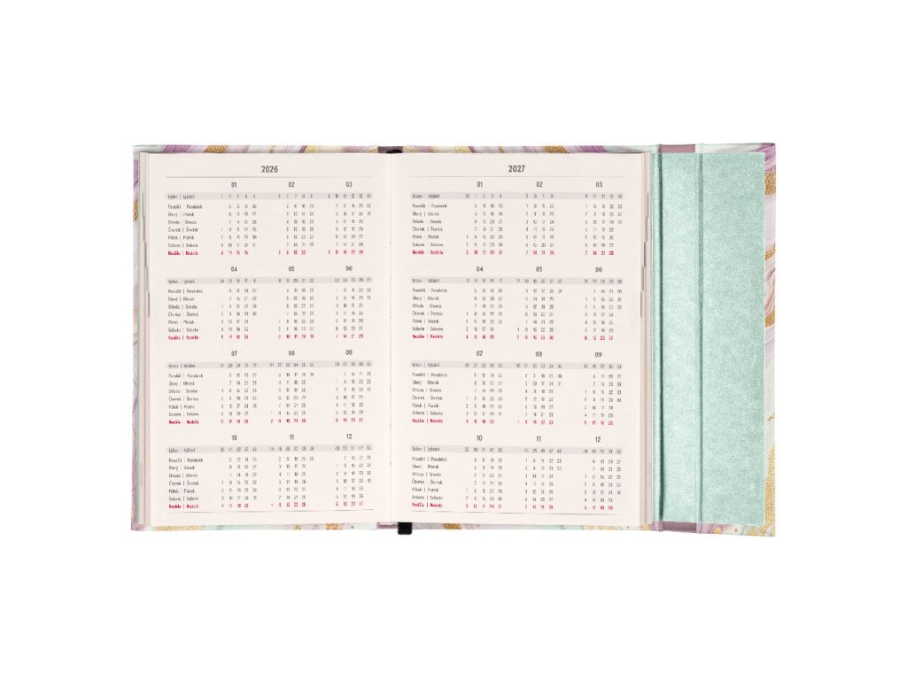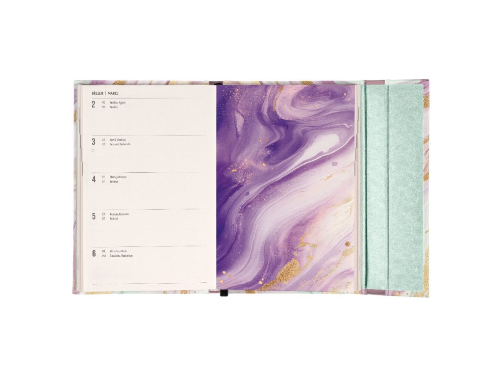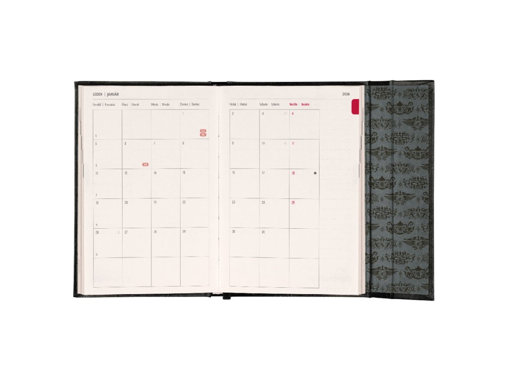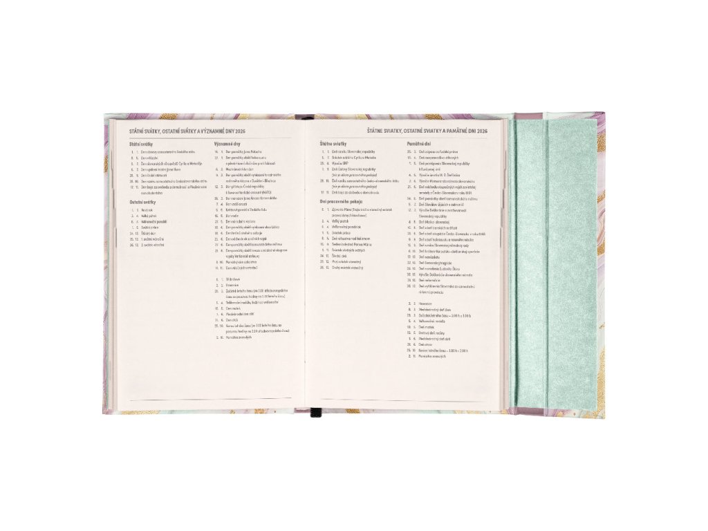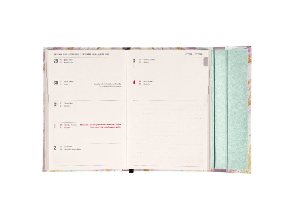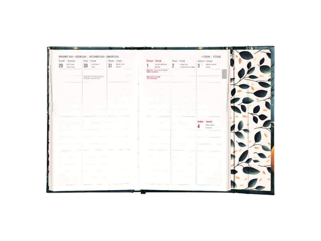 Týdenní diář s praktickým magnetickým uzavíráním je ideální volbou pro ty, kteří chtějí mít své plány přehledně pod kontrolou. Horizontální rozložení s českým a slovenským kalendáriem ve verzi týden na dvou stranách s prostorem pro poznámky. Součástí jsou praktické měsíční přehledy, ideální pro plánování dovolených či prázdnin, a také seznam českých a slovenských svátků a jmenin.