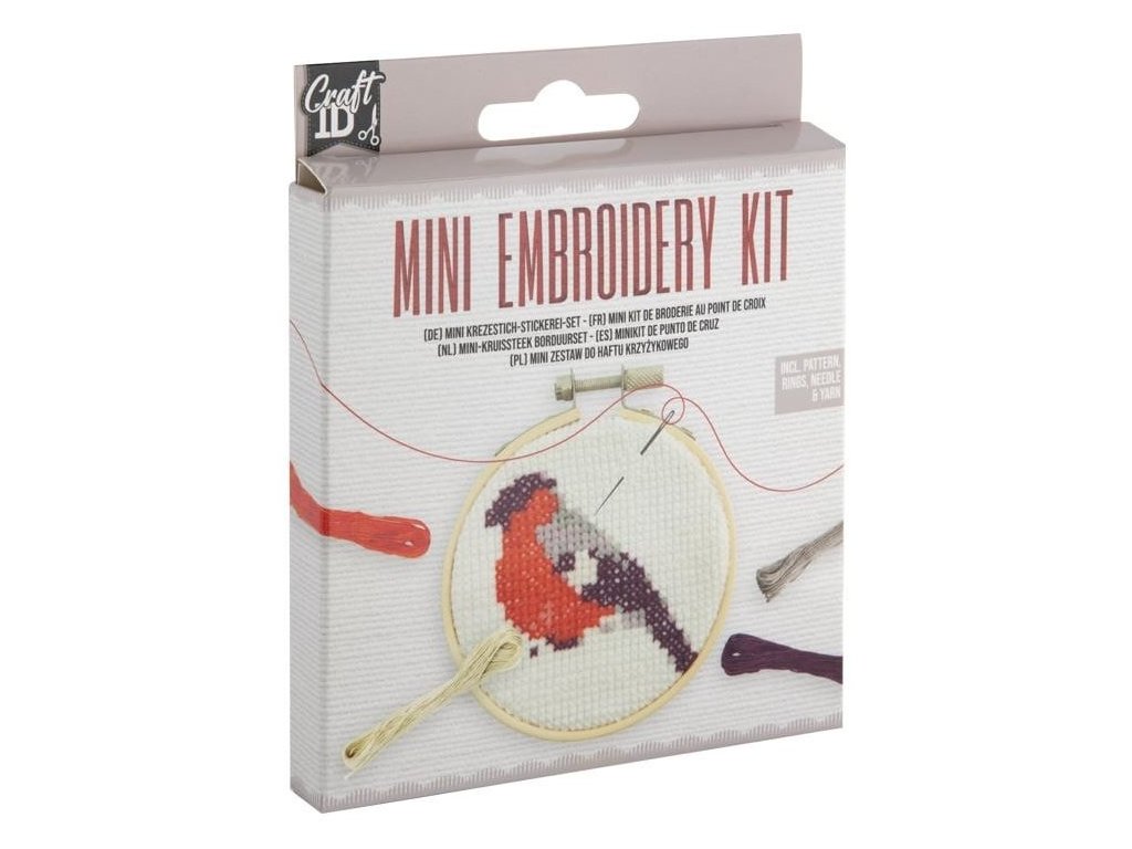 Praktická sada Mini Embroidery Kit, kde je vše na vyšívání obrázku včetně dřevěného vyšívacího rámečku. Sada obsahuje: dřevěný vyšívací kruh, 8 barev přízí na vyšívání, látka na vyšívání, 1 jehlu a návod včetně vyšívaného vzoru. Průměr vyšívacího kruhu cca 9 cm.